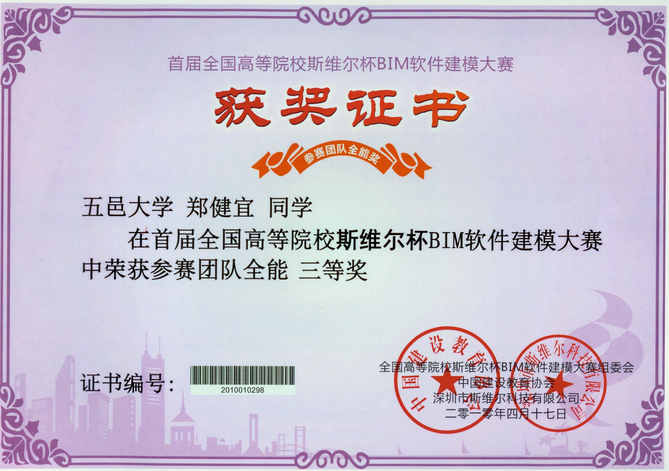 首届全国高等院校斯维尔杯BIM软件建模大赛获奖证书