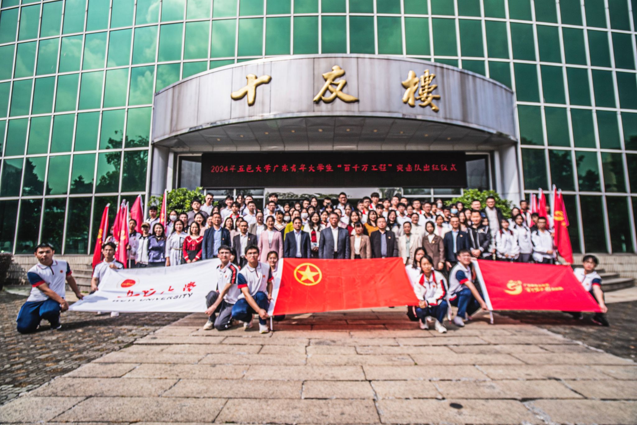 1月19日,2024年五邑大学广东青年大学生“百千万工程”突击队行动出征仪式在十友楼举行。校党委副书记李霭康出席,学校相关职能部门负责人、学院党组织书记、专职副书记、团组织负责人、青协指导老师、校团委全体老师及学校广东青年大学生“百千万工程”突击队师生代表参加出征仪式。