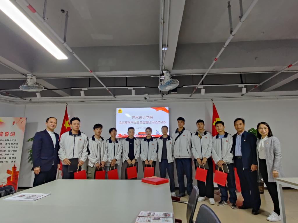 12月6日,艺术设计学院在北主楼2002会议室召开退役学生座谈会暨征兵工作动员会。艺术设计学院党总支书记黄章文、副书记韦金艳、有关辅导员以及9名退役复学学生、学生干部、学生党员代表等参加了会议,学校退役军人服务中心曹荣军同志受邀出席会议。