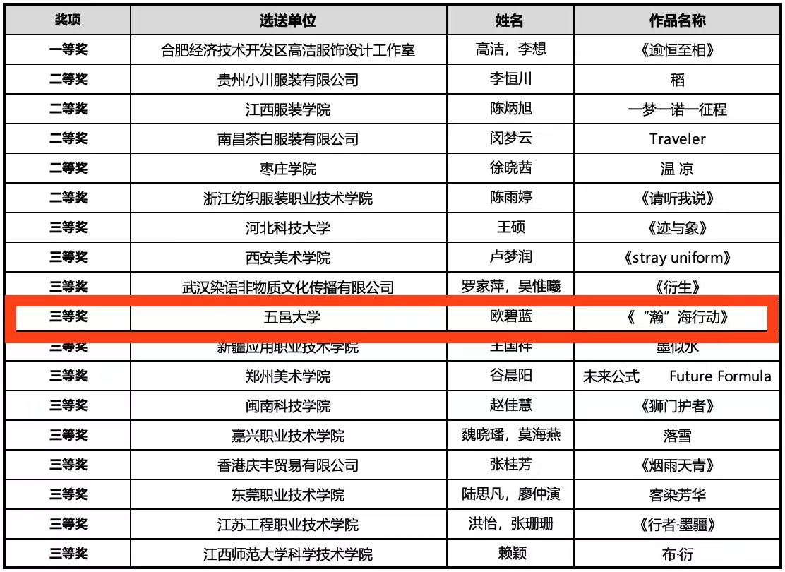 近日,第八届中国国际时装设计创新作品大赛总决赛在第九届中国(深圳)国际时装节期间举行。经专家组评委现场评审,艺术与设计学院教授肖劲蓉指导的2018级服装与服饰设计专业学生欧碧蓝的作品《“瀚“海行动》在决赛中荣获三等奖。